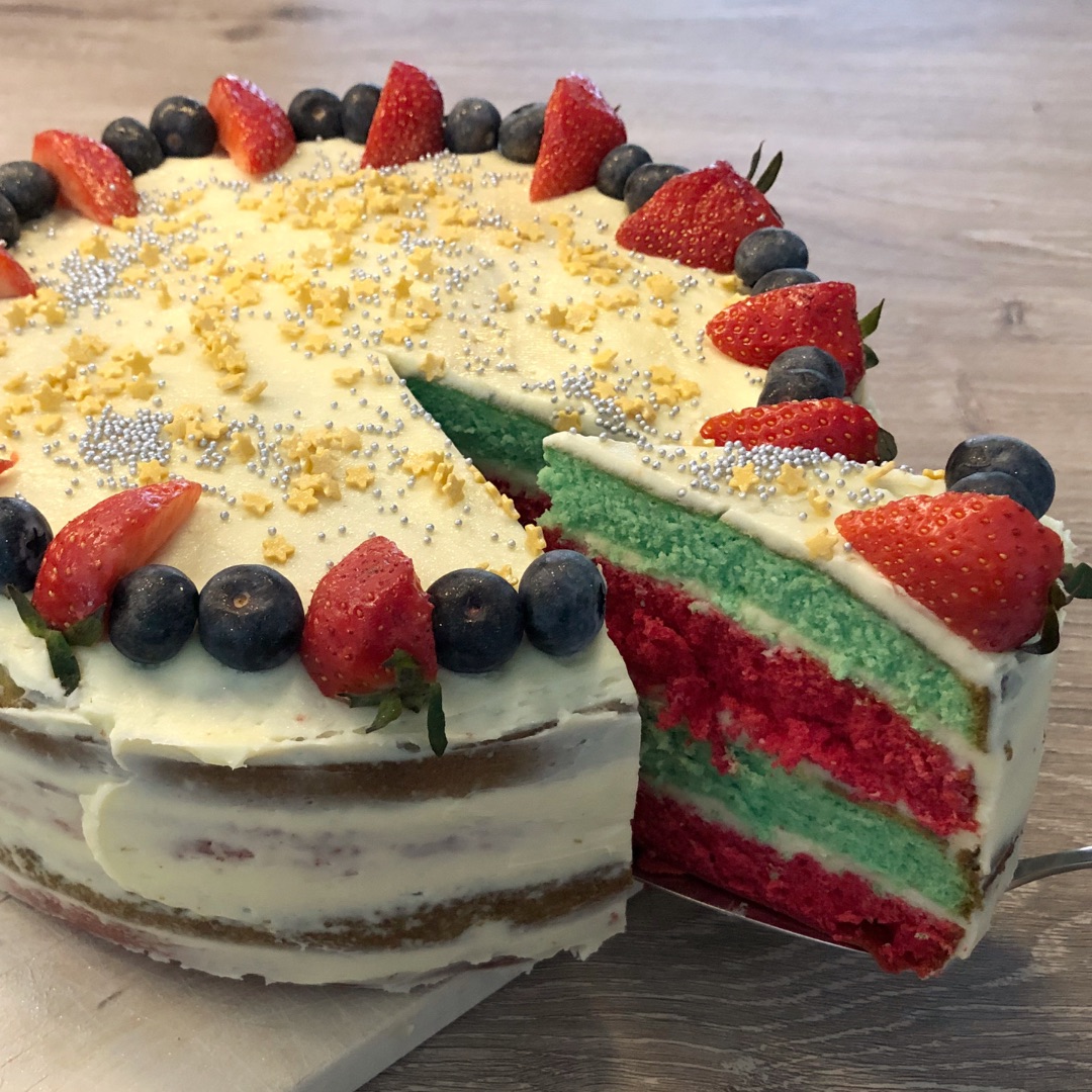 Laat beide taarten volledig afkoelen en snijd ze beide een keer door. Leg een rood of groen taartdeel op een mooi bord of taartschaal. Doe hier naar smaak wat jam of curd op en bestrijk met een mooie laag botercrème. Leg vervolgens een taartdeel met een andere kleur er bovenop en voer dezelfde stappen uit totdat alle taartdelen op zijn. Smeer de bovenkant in met een laagje botercrème en de zijkanten naar wens ook. Versier de taart naar eigen smaak met sprinkles en vers fruit.